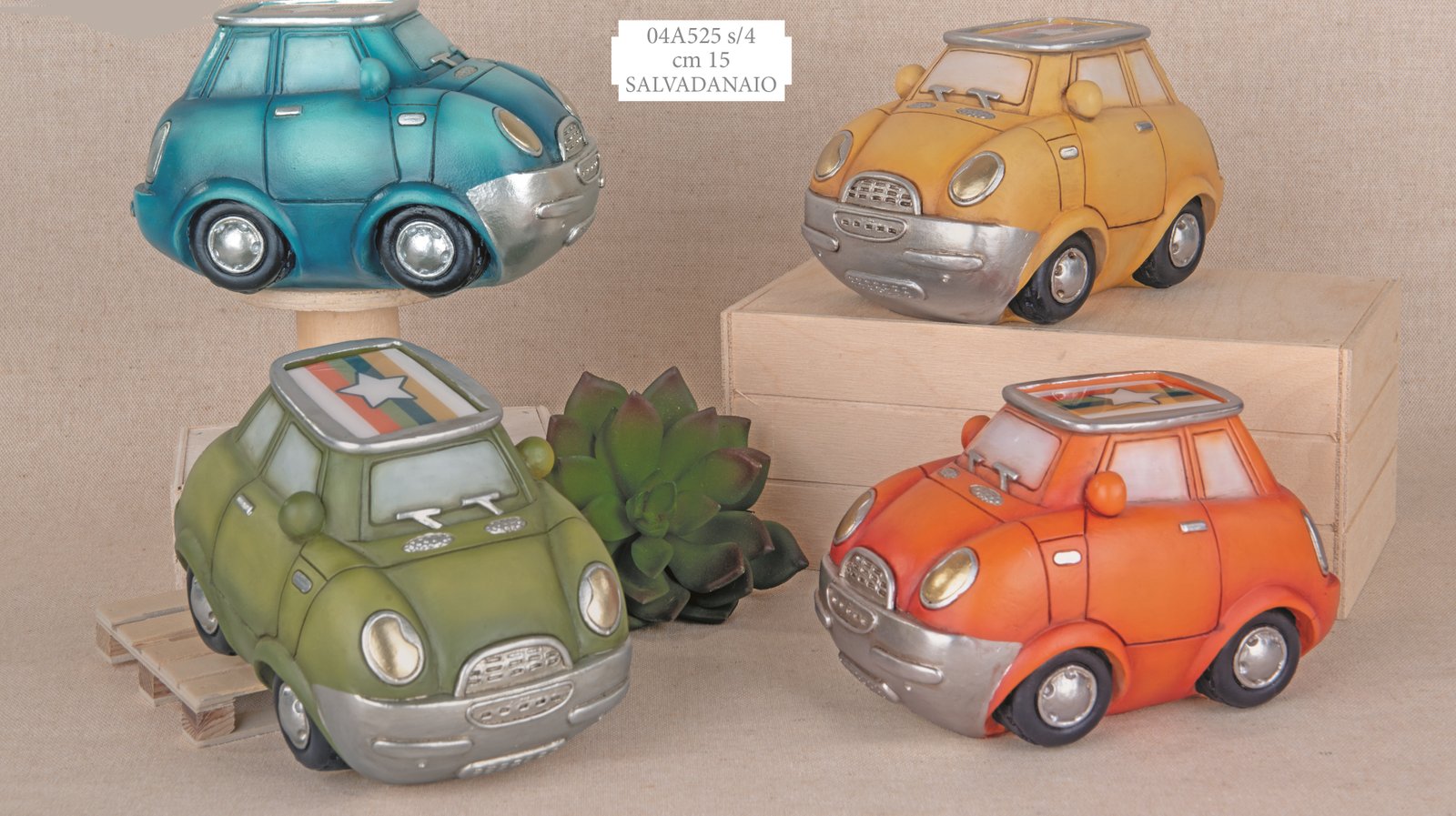 L’auto da corsa è simbolo di velocità e avventura, il salvadanaio insegna educazione finanziaria. In ceramica cm.15 4 assortiti, è divertente, educativo e decorativo – perfetto per piccoli piloti.