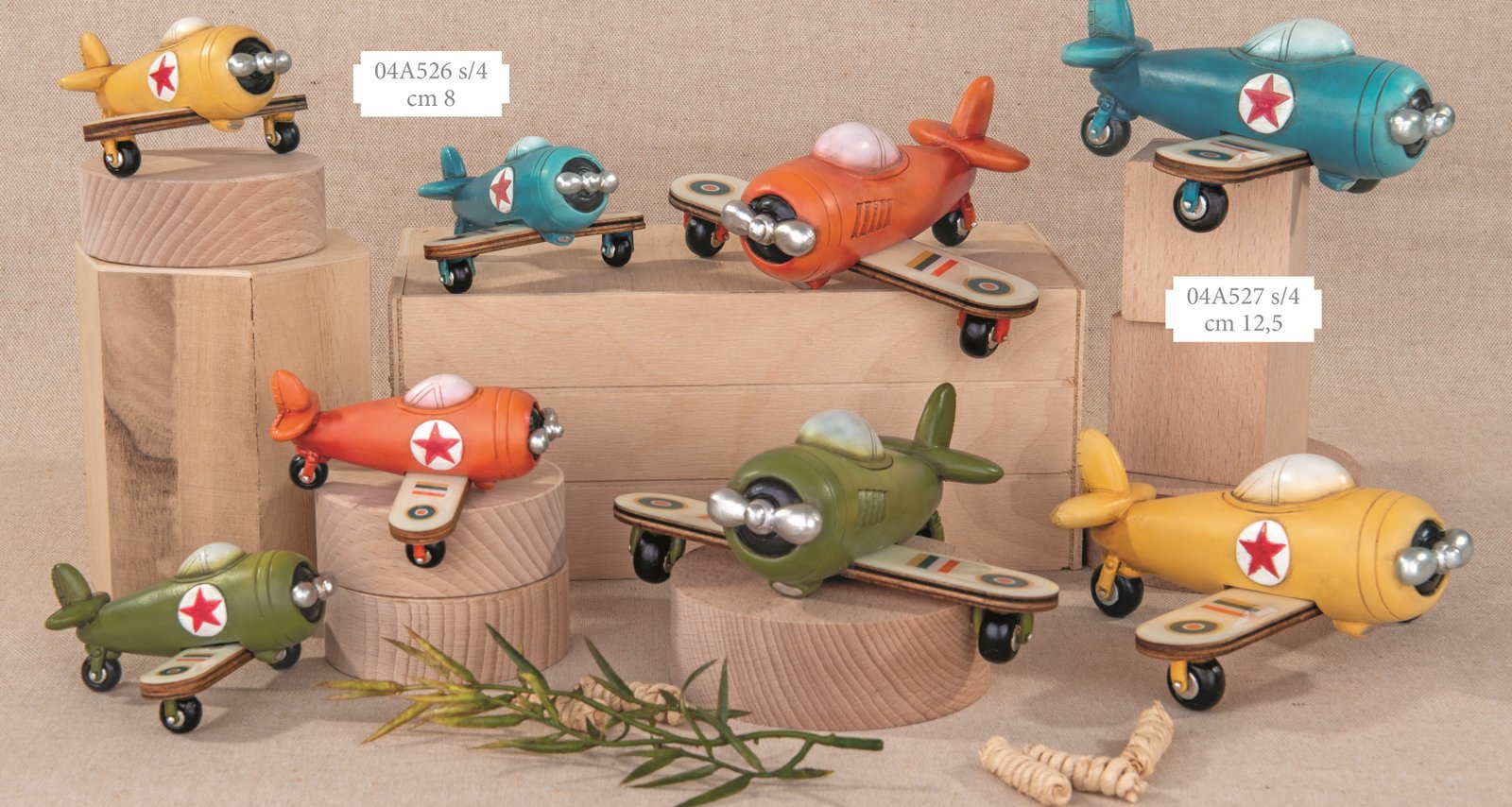 cm.8: versione compatta, perfetta per bomboniera o segnaposto. cm.12,5: versione più grande, scenografica per mensola o cameretta. Stesso design Speed Aereo, 4 assortiti.