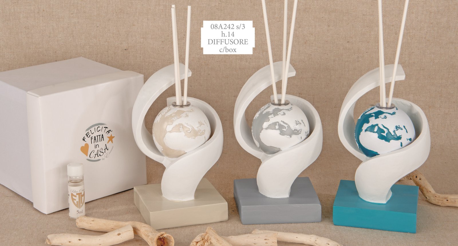 Un mondo che profuma di avventura infinita: il **Mondo Diffusore Spiral** è la **bomboniera** cosmica e profumata, perfetta per Matrimoni tema viaggio, Anniversari e Lauree. Globo in vetro trasparente con spirale interna (altezza **14 cm**, **3 assortiti**, con box), bastoncini e fragranza inclusa. È il regalo che fa viaggiare i sensi. Ordina ora con spedizione rapida in tutta Italia su www.bombonierecupidotrapani.it! Nota: il prezzo si riferisce solo alla bomboniera; personalizzazioni e confezione si pagano a parte.