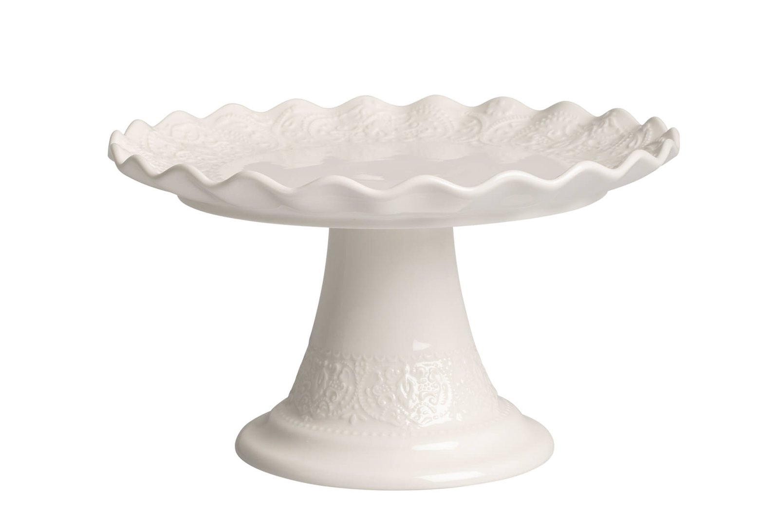 Raffigura eleganza classica e ospitalità, un trend domestico attuale. In porcellana bianca decalco, è funzionale per dolci e decorativa, rendendola un ricordo utile e raffinato per la tavola.