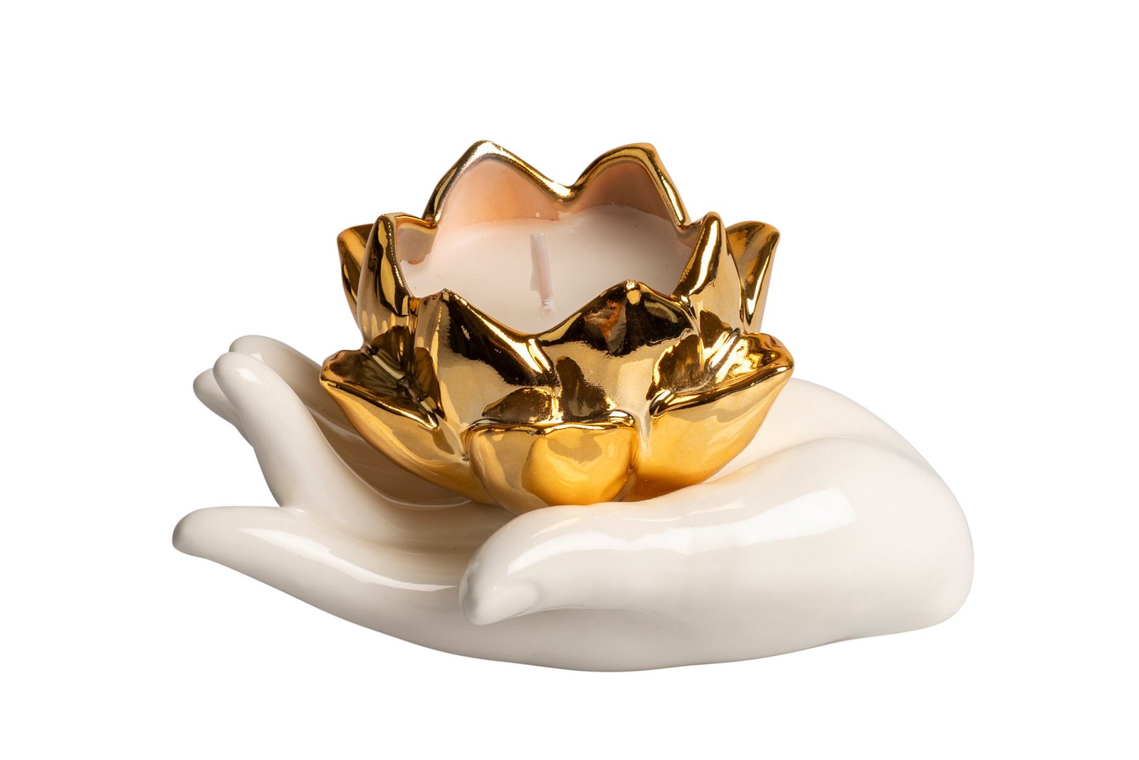La mano simboleggia tenerezza e protezione, un trend romantico attuale. Con candela fiore oro in porcellana, è decorativa e luminosa, rendendola un ricordo passionale e durevole.