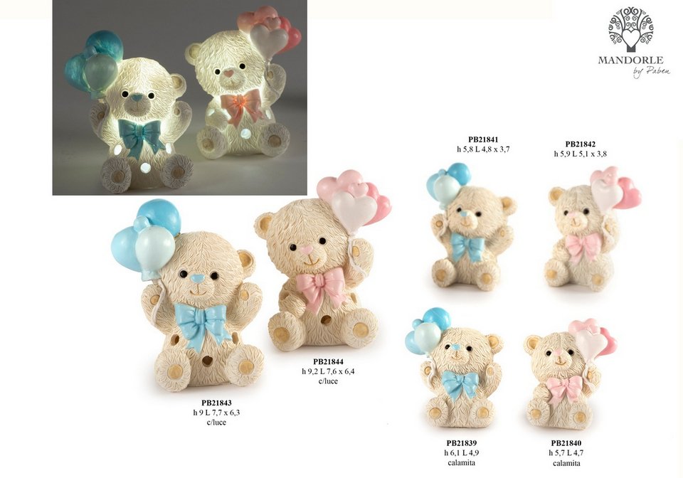 Perfetti per nascite, battesimi o compleanni a Trapani e in Sicilia, questi orsetti sono realizzati in resina e disponibili in vari modelli e colori assortiti, come celeste e rosa. Scegli tra la versione calamita, la statuina o l'orsetto con palloncini dotato di luce.
