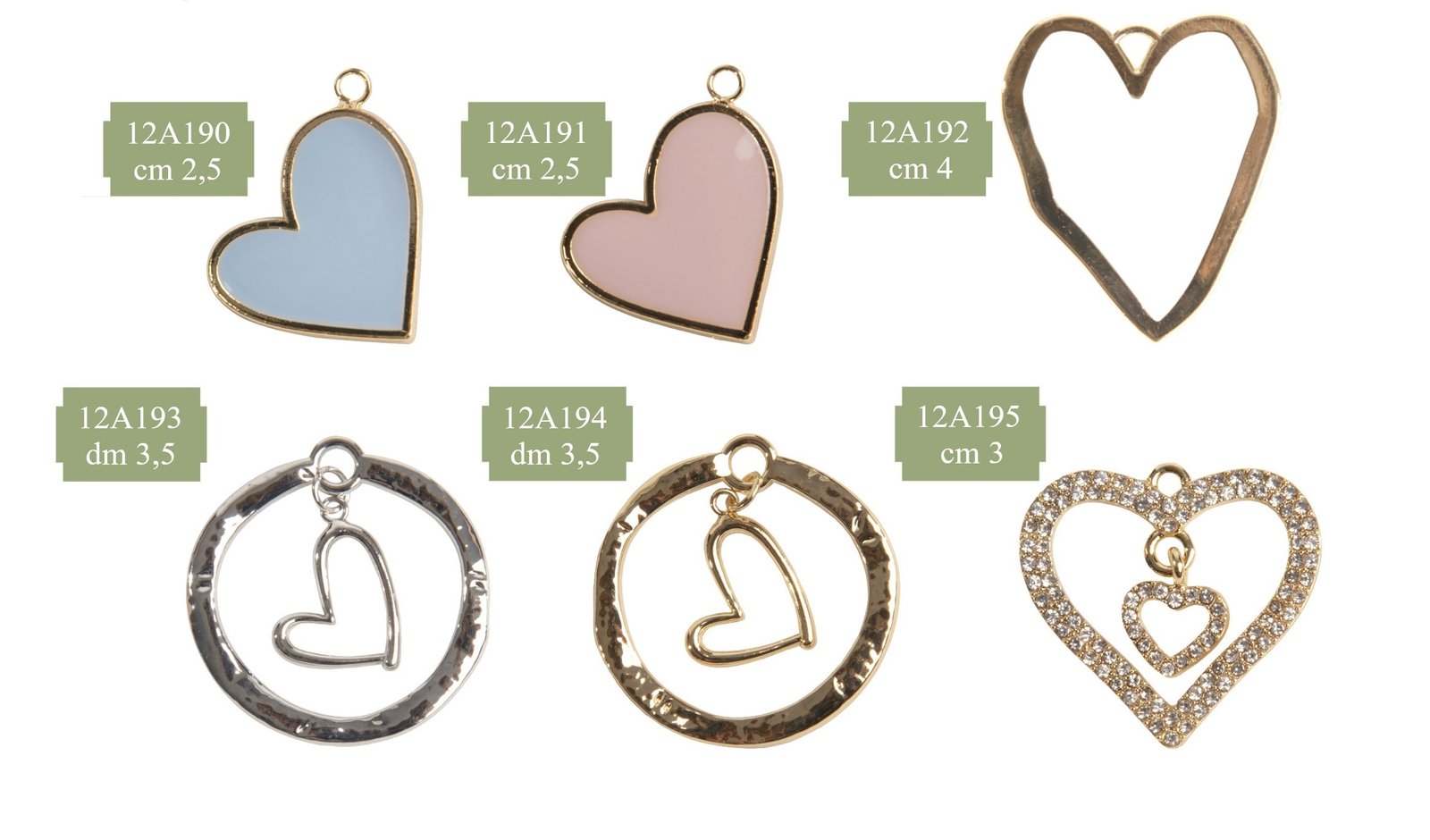 12A190 - ZAMA CUORE BABY CIELO CM.2,5 PREZZO 1.00 12A191 - ZAMA CUORE BABY ROSA CM.2,5 PREZZO 1.00 12A192 - ZAMA CUORE MODERNO ORO CM.4 PREZZO 0.90 12A193 - ZAMA CUORE CERCHIO SILVER DM.3,5 PREZZO 1.40 12A194 - ZAMA CUORE CERCHIO ORO DM.3,5 PREZZO 1.40 12
