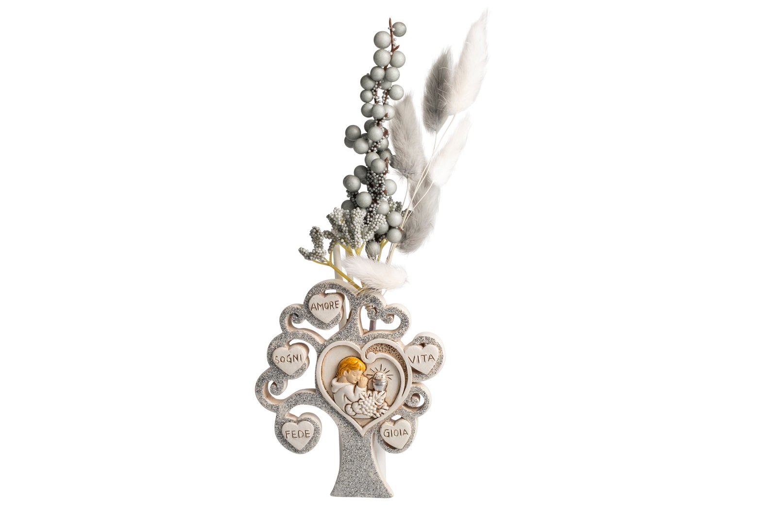 ICONA PROFUMATORE ALBERO DELLA VITA CON BIMBO COMUNIONE CM. 11.5 CON GLITTER IN SILVER - CON BOX