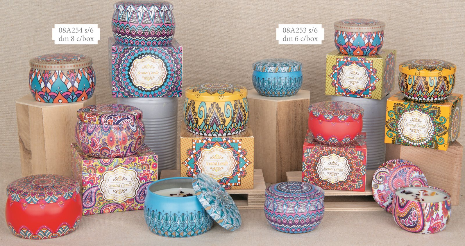 08A253 - MOSAICO CANDELA METAL BOX DM.6 6 ASS. PREZZO 4.70 08A254 - MOSAICO CANDELA METAL BOX DM.8 6 ASS. PREZZO 6.80