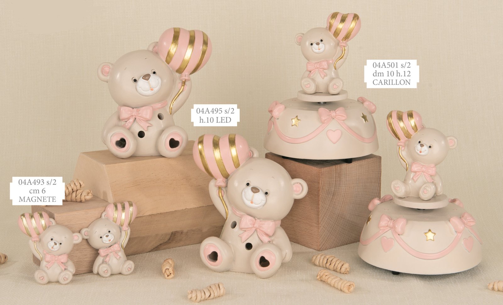 Pupo Orso Rosa Magnete LED Carillon Bomboniera 04A493-04A501, ideale per Battesimo femminuccia.