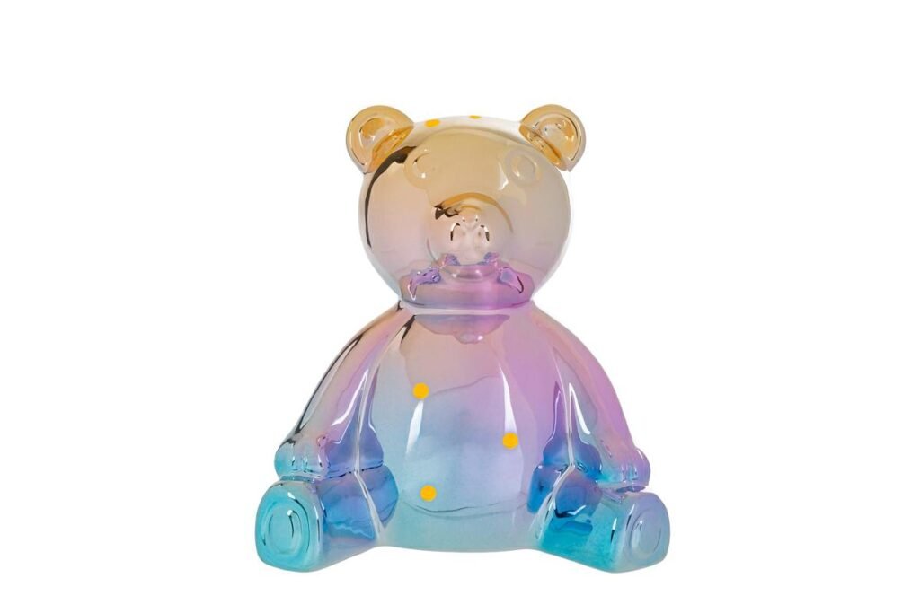 Ceramica lucida + glitter argento + luce LED calda = orsacchiotto da favola. 11×8×h.11 cm è perfetto per comodino o mensola – luce e coccole garantite.