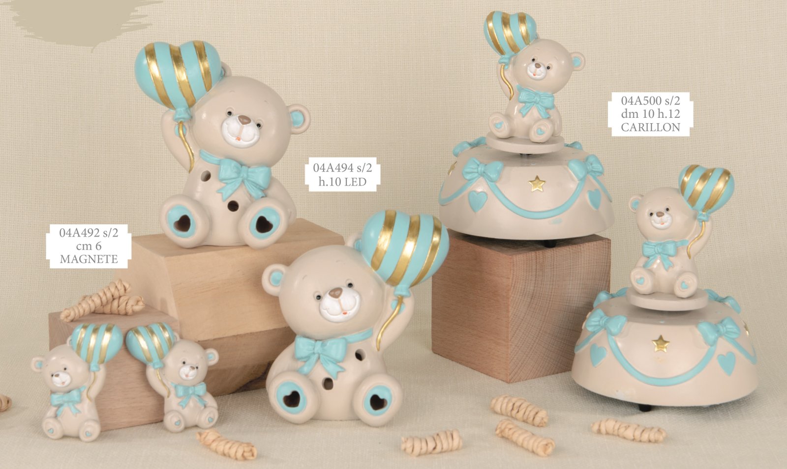 Magnete cm.6: piccolo da frigo. LED h.10: luce notturna. Carillon dm.10 h.12: dolce melodia. Tutti 2 assortiti celesti, design Pupo Orso.