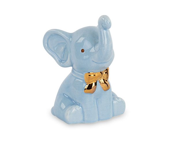 L'elefante simboleggia protezione e saggezza, un trend infantile forte per il 2026. L'azzurro aggiunge freschezza, rendendolo un ricordo fortunato e protettivo per nascite di maschietti.