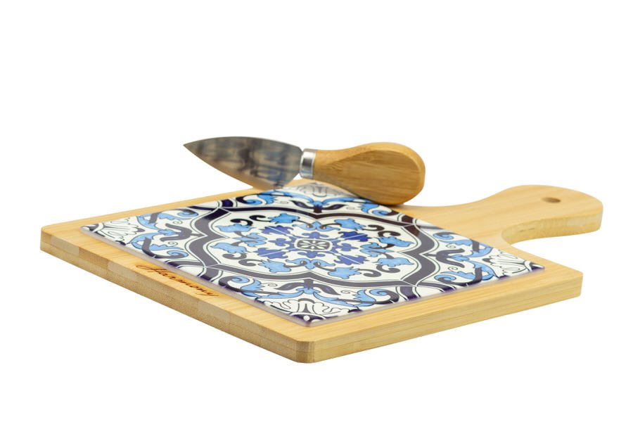 PRMT24149PB - TAGLIERE GRANDE PORCELLANA CON MANICO LEGNO, COLTELLINO INCLUSO, DECALCO MAIOLICA BLUE CON BOX (NO FAZZOLETTO)